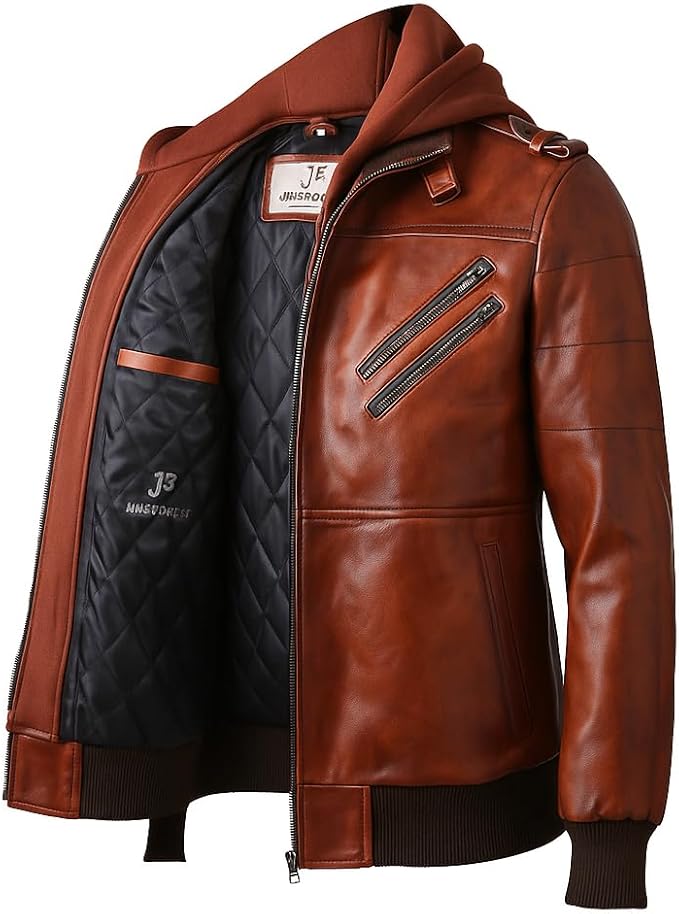 JacketStreet Men's Premium Brown Leather Bomber Jacket, Hooded Motorcycle Style with Quilted Interior, Ribbed Cuffs and Hem